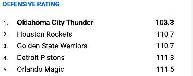 And yet somehow, we’re old and trash now? Because we started 13-12? Because Steph missed five games and in those games the Warirors only went 3-2, including a loss to the 21-1 defending champion Thunder and a 1-point loss on the road to the 76ers? Let me tell you what actually happened during those five games. The Warriors went to Cleveland and Chicago and won, held four of their last five opponents below 100 points, and climbed to the second best defensive rating in the entire NBA.