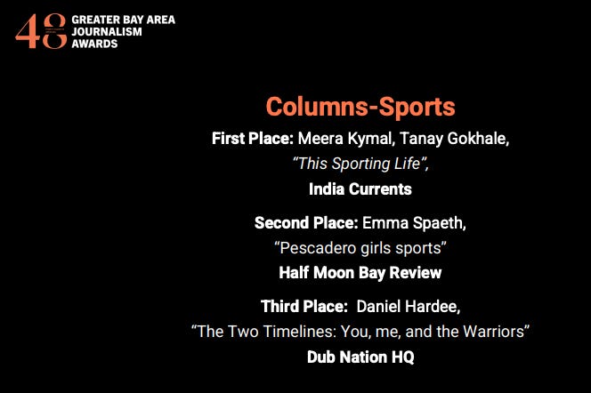 Great news folks, Dub Nation HQ took home a third San Francisco Press Club award in four years, winning bronze in the highly competitive COLUMNS-SPORTS Print/Digital - Small Newsroom category.