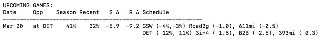 However, the reason it’s even remotely close is: Yes, this is a bad schedule game for GSW (3rd game of a road trip, long flight), but this is even worse for DET, who are flying back from WAS last night for their 3rd game in 4 nights. This is a net 8% win probability loss for DET from the schedule.