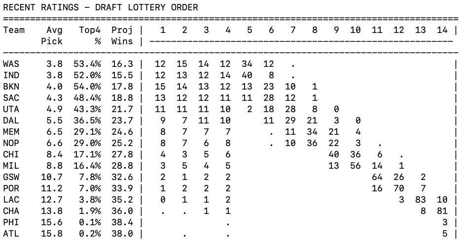 Here is APRIBOT’s projection for likely lottery seeds. She thinks GSW is almost certain to land at the #11 or #12 lottery seed and have about a 7% chance to win the lottery, assuming GSW loses out of the Play-In. If GSW win the Play-In, then they will get something like the #15 pick.