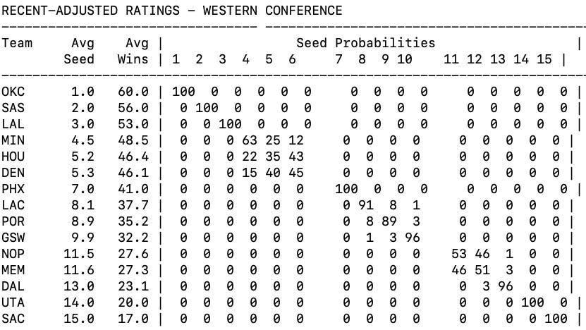 FYI I’ve mentioned consistently in the comments that GSW is almost certain to finish in the #10 spot no matter what it does. However, I thought I should run some simulations to see if that really is plausible, and it turns out APRIBOT does agree with me.