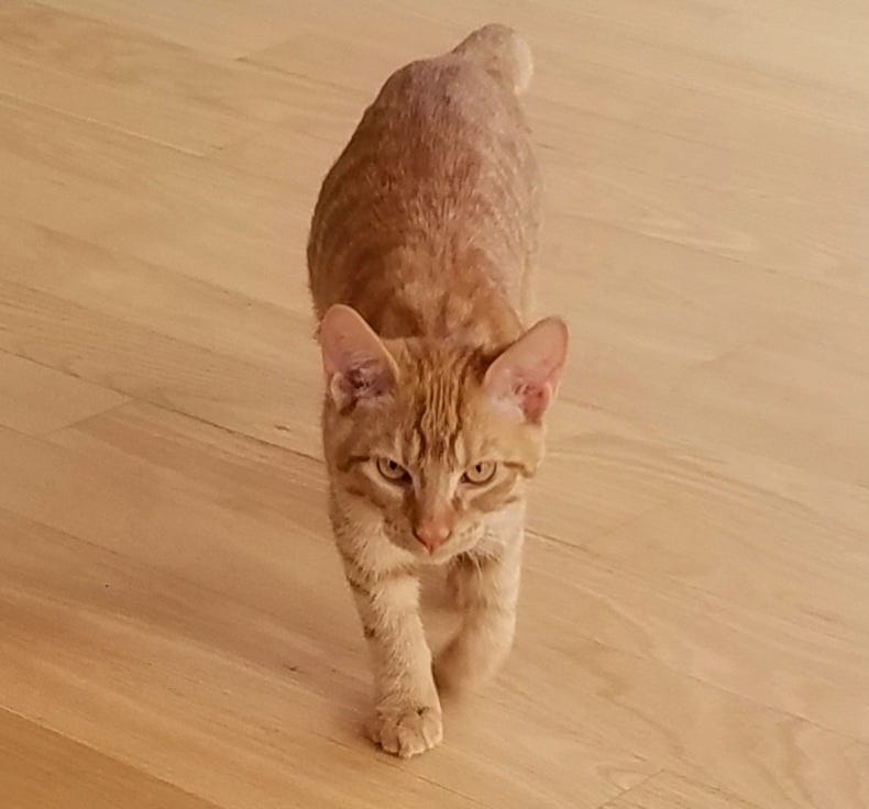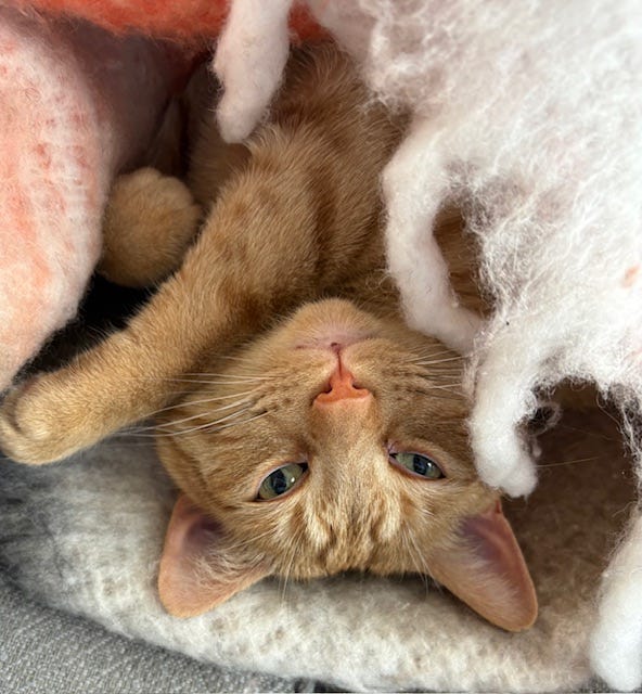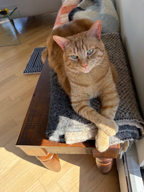 Eddie wouldn’t put on the Klay shirt so he is lounging tout nu in his golden glory. Notice those giant paws - no one can best him chasing and batting a ball on the hardwood. Love to all at DNHQ!