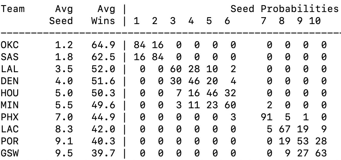 She also thinks there is a 9% chance of GSW sneaking into #8, and 27% chance of stealing home court for the Play-In at #9.