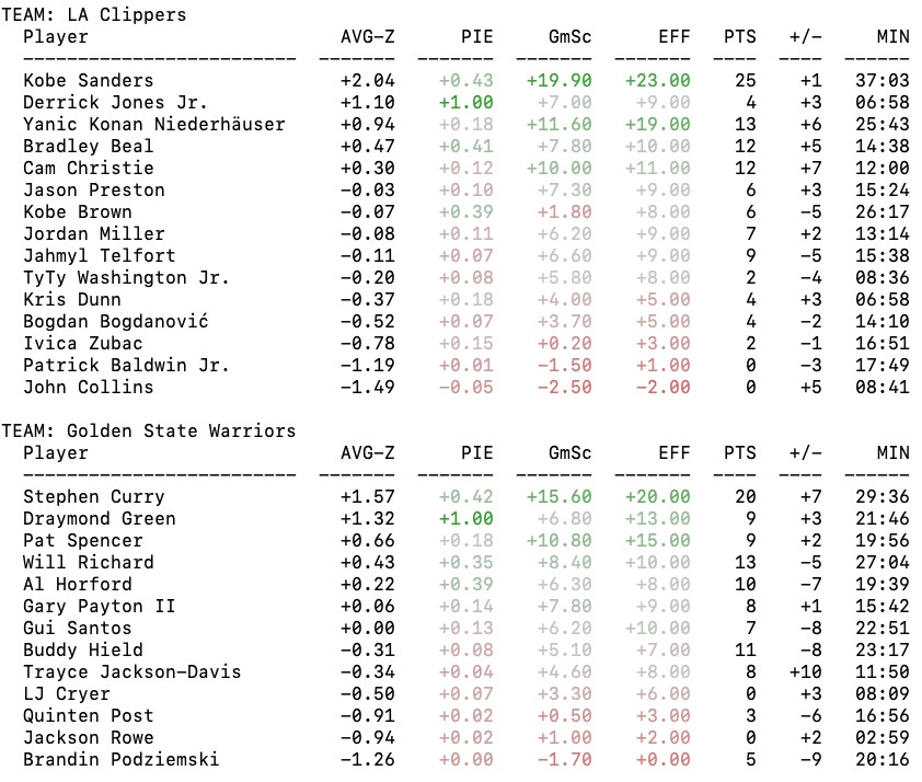 Basically, APRIBOT computes for each player the NBA Player Impact Estimate, Hollinger Game Score and FIBA Efficiency and converts them to z-scores (0.0 = average for all players, +1.0 = 1 standard deviation above). Then lists the average of the three along with the +/-, PTS and MIN played.