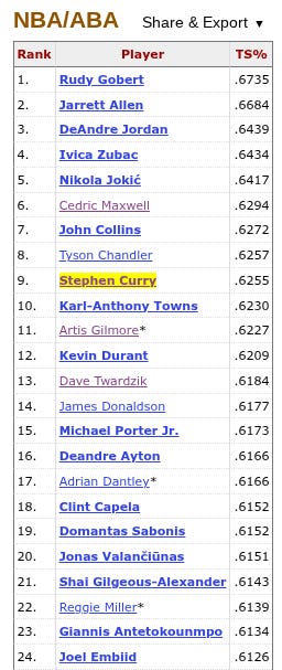 The only guard… wait.1 Double-checking. Who is Artis Gilmore… nice. So, maybe even top-20 in shooting efficiency as well…This is a crazy list, I won’t click through all the names I don’t recognize, but safe to say that Curry is an extreme outlier when it comes to scoring.2