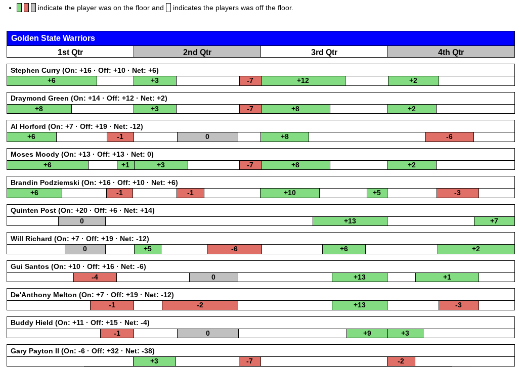 As an example, take a look at the table below. Don’t worry too much about the specifics, but know that this is the simple on/off plus minus, you can see the full details here, but note the green bars that the full strength (minus Jimmy and Kuminga) show up with. Even depleted, this is a solid roster that can win games, against any opponent.