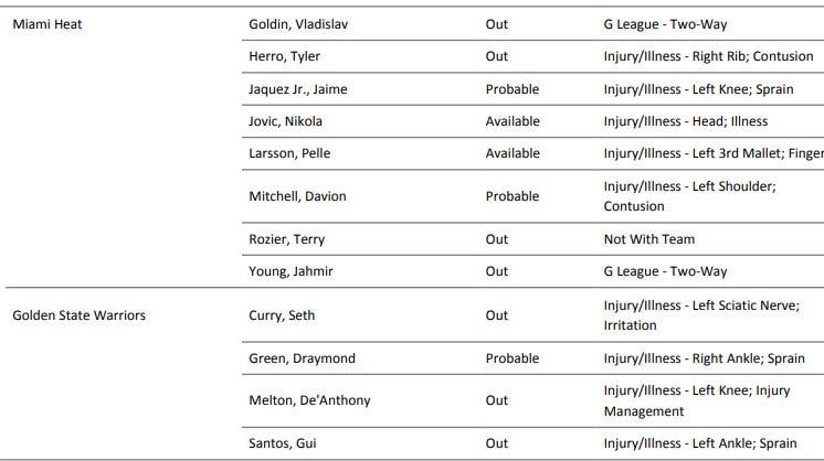 Thankfully, today’s injury report is clear, and it looks like Butler will be back with the team. The Warriors will be playing without Gui Santos (still recovering from that rolled ankle), and De’Anthony Melton (back-to-back game management). The Warriors host the Toronto Raptors tomorrow, so expect Melton to return for that and Al Horford should play tonight but be out tomorrow. Playing the long game!