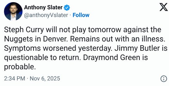 Curry - who has looked off lately - missed last game with a sickness that hasn’t yet passed. Adding to the woes, it doesn’t sound like Jimmy Butler or Draymond Green are at 100% either.