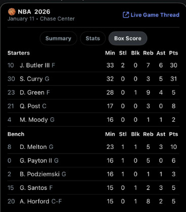 Most of the bench is fine - and more importantly cheap. With Melton and Horford beginning to get in the swing of the game, the back end of the roster is decent. But the reason that last loss hurt so much is because of how empty the stat sheet was outside of Curry and Butler.