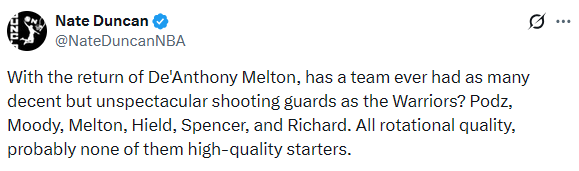 On Christmas, NBA analyst and podcaster Nate Duncan (no relation, I swear) tweeted a point about the Warriors’ team construction that I’ve been thinking about over the past week.