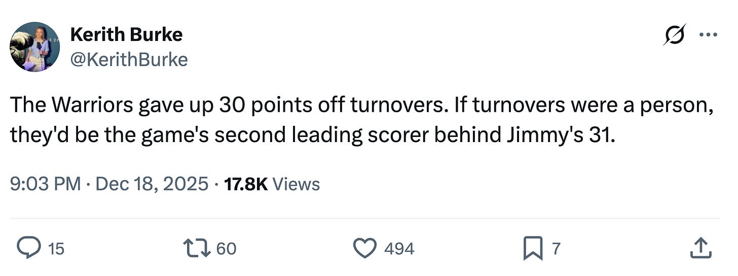 Btw, do you know what the Warriors record under Coach Steve Kerr all-time is when they have 20 or more turnovers? Forty-nine wins, fifty-eight losses.