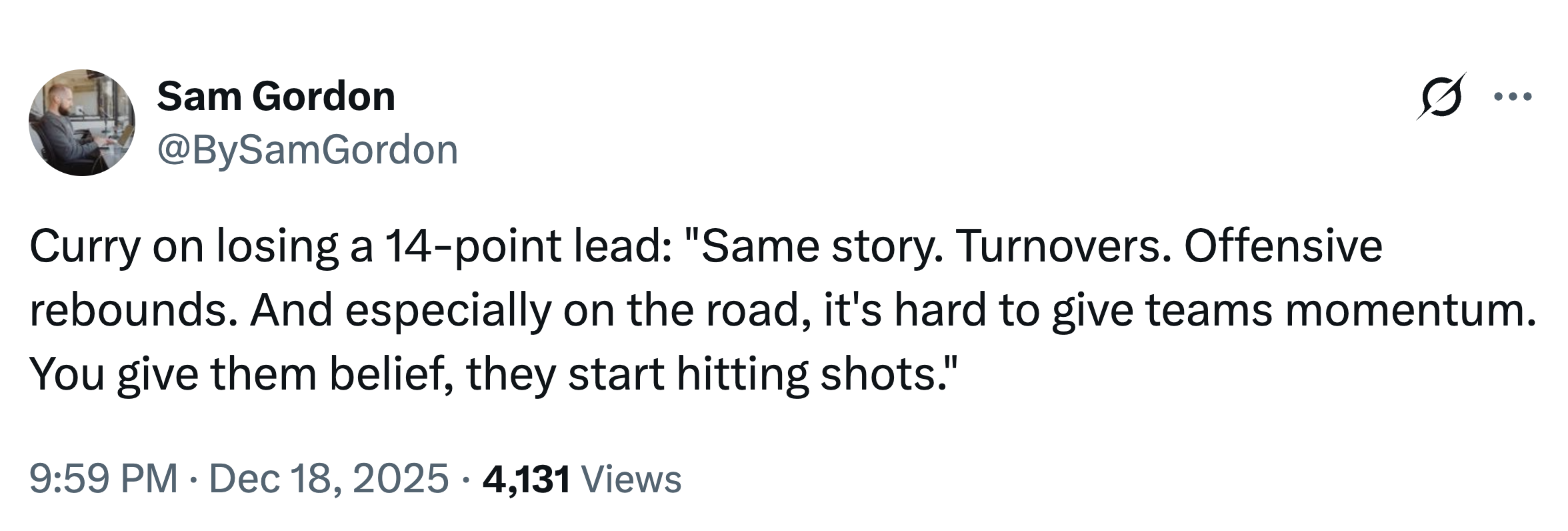 These aren’t just close games where turnovers were the difference. These are games where the Warriors beat themselves so thoroughly that the opponent didn’t need to be special. Miami shot 40.6% from the field and won by 14. Phoenix shot 41% and won. The defending champs from OKC didn’t even need to be great as the Warriors just handed them a 24-point blowout.