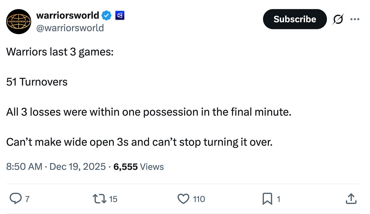 This is what keeps me Dub Nation up at night. Not the losses where you get outplayed by better teams. Those you can stomach. It's the ones where the Warriors have enough, where the formula is right there, where all they have to do is not throw the damn ball away that makes you want to put your fist through the TV. A sure win turned into the same old script: play well enough to lead, get careless, watch it slip away, wonder why this keeps happening. But I'll be back next game. We all will. Because that's what generational trauma looks like. You keep watching, keep believing, keep hoping that maybe this time they'll value the ball.