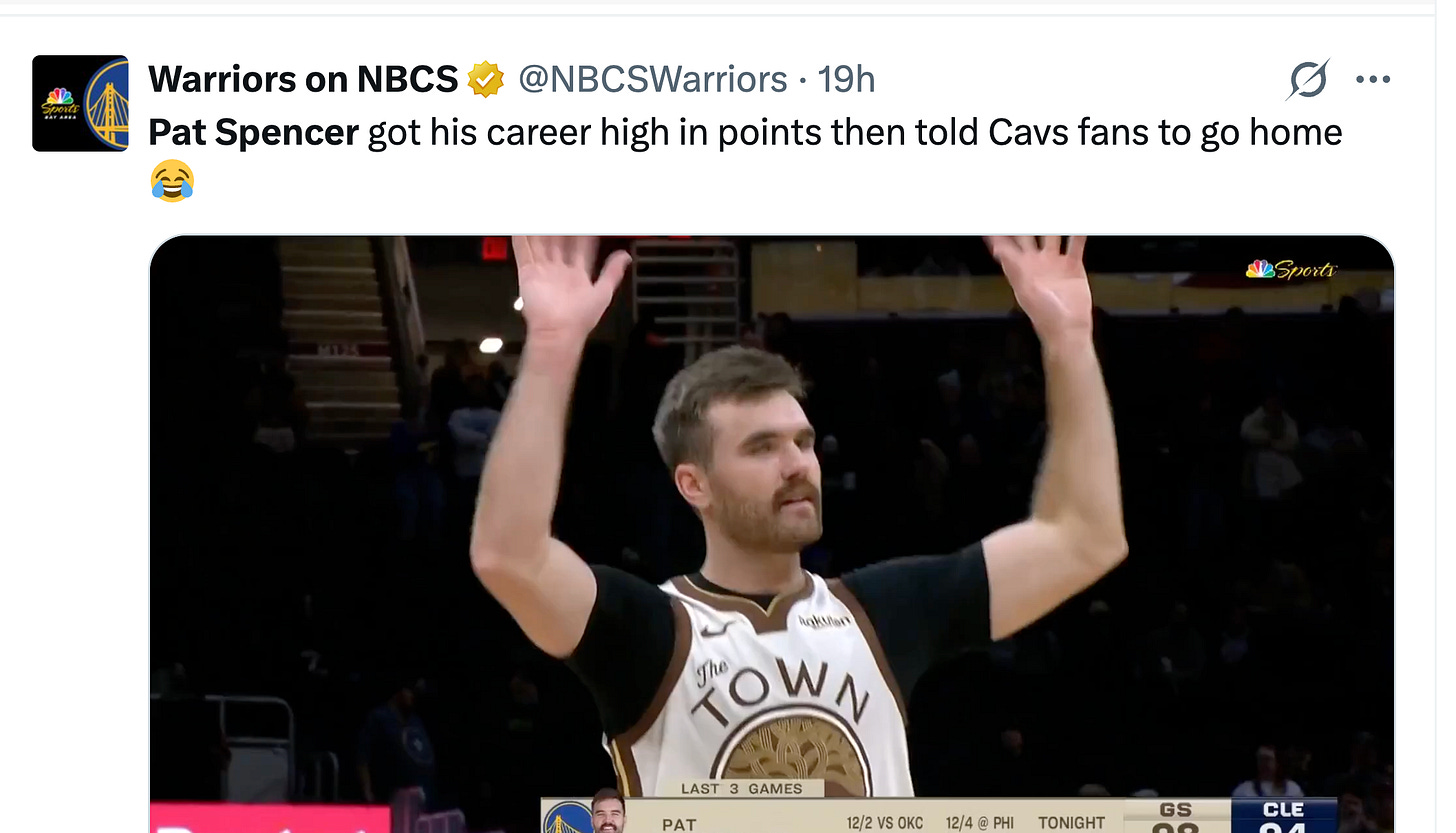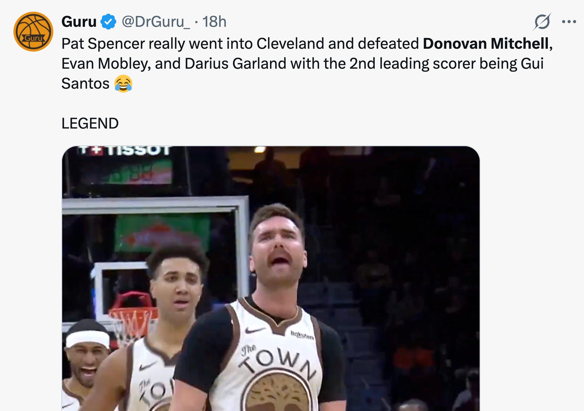 Pat Spencer put up 19 points like he’d been saving them in a vault and hit three triples, all career highs. He played like a man who’d spent years watching Steph Curry weaponize joy and decided to activate a some of that glow. The audacity of it: to stroll into the building where LeBron (and the refs) once raised a banner over the Warriors, and dismantle the Cavs. And the Cavaliers rolled out a starting lineup with an assortment of first round draft picks, a few straight from the lottery. We’re talking All-Stars in Donovan Mitchell and Darius Garland, a Defensive Player of the Year in Evan Mobley.